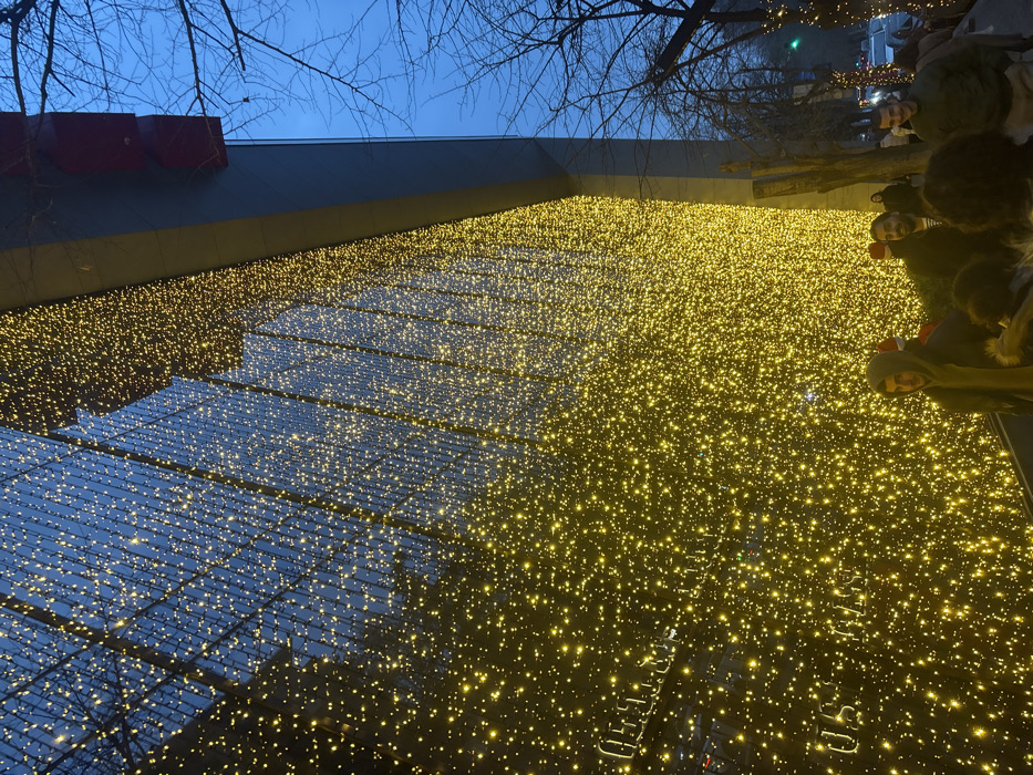 The image displays an urban scene at twilight or night in Tbilisi, Georgia. A large building facade on the left is densely covered with warm yellow string lights, creating a brilliant, shimmering curtain effect that extends vertically across the visible portion of the structure. Reflections of the dark blue sky are visible in the building's surface behind the light strands. To the right, elements of the building's architecture, including a concrete or grey pillar, are present. In the lower foreground, a group of approximately eight to ten individuals, dressed in winter clothing, walk along a pedestrian path beside the illuminated building. Their gazes are generally forward. One individual in the mid-ground appears to wear a red hat. Bare tree branches are silhouetted against the deep blue sky on the upper right, and in the distant background on the right, streetlights and vehicle lights are visible along a thoroughfare.