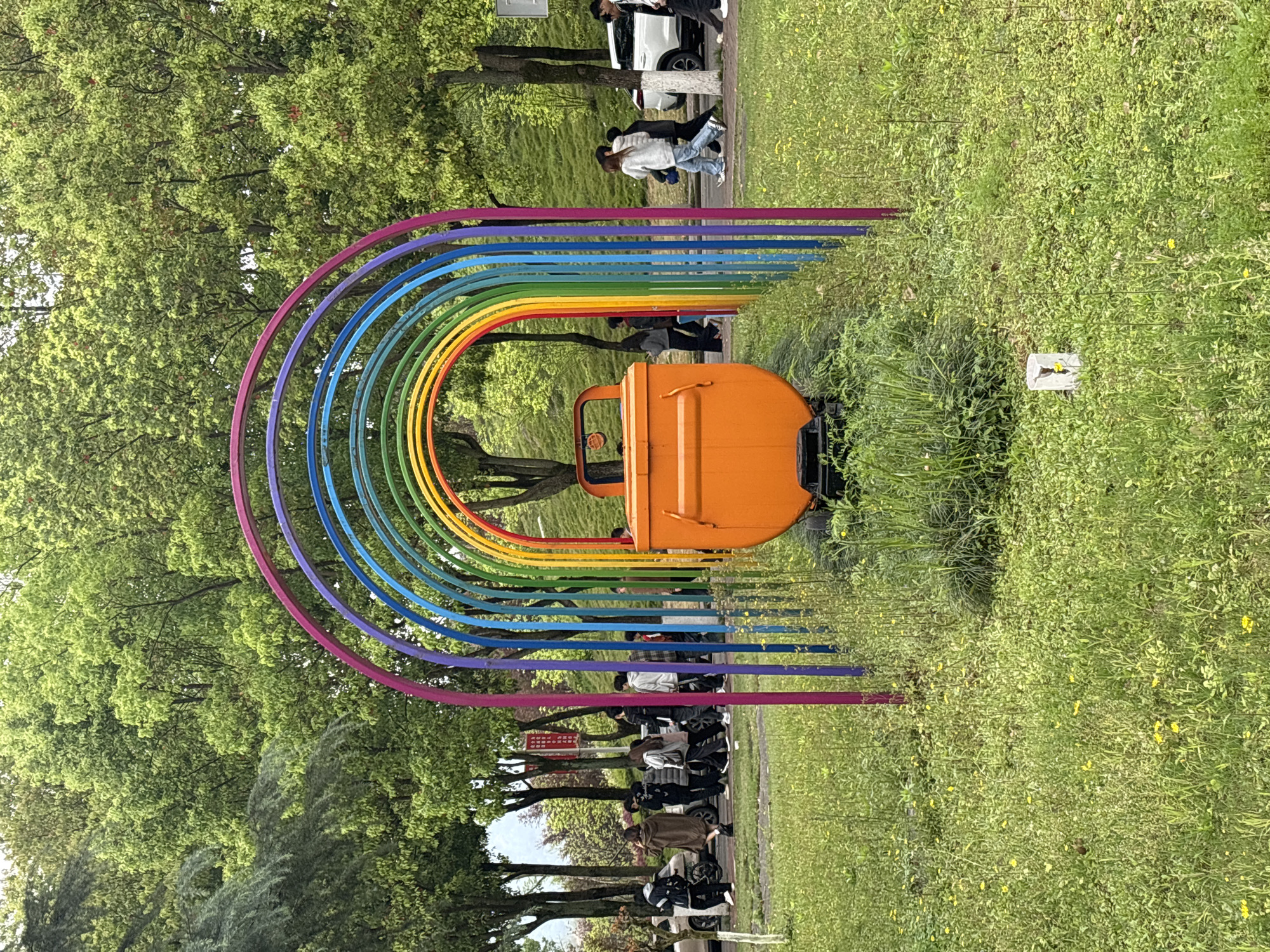 rainbow-colored archway in a park in Jiangjin, China. The archway is made of multiple parallel metal bars, each painted a different color of the rainbow. An orange vehicle is situated under the archway. People are walking and standing near the archway. The park has green grass and trees.