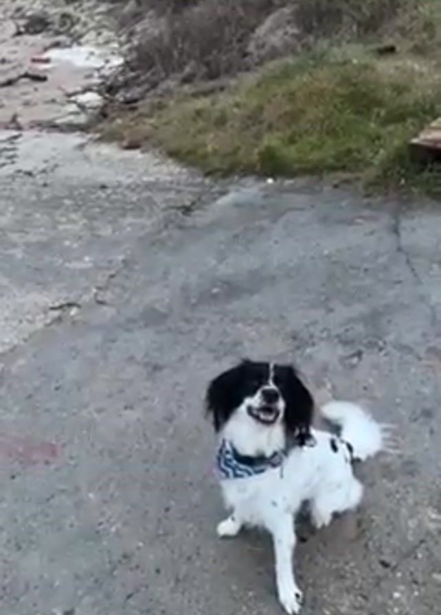 - "A white and black spaniel-type dog with a distinctive black face and ears sits happily on a concrete surface, then runs towards a sandy beach and the water" by FM-LVnhY2, licensed under CC BY 4.0
