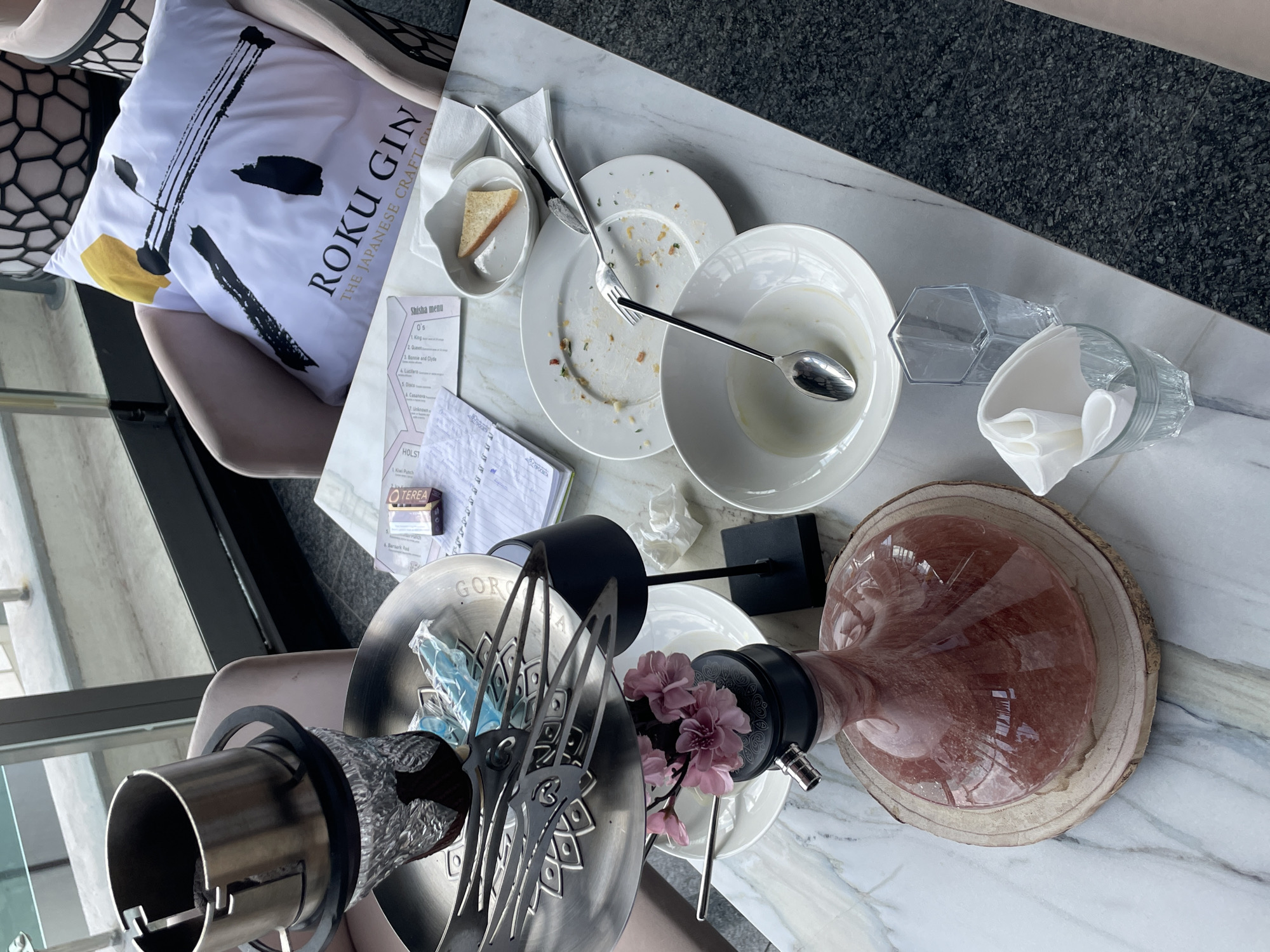 An overhead shot depicts a marble-topped table and seating area, suggesting a bar or lounge setting. The specific location is identified as "Holst - Terrace & Bar" in Paradise Center, Sofia, Bulgaria, based on visible menus and environmental context. The table, a combination of white marble and dark speckled granite, is laden with items indicating recent use. A prominent shisha (hookah) setup occupies the left side, featuring a reddish-pink swirled glass base resting on a rough-cut wooden slab. Its black stem is adorned with artificial pink cherry blossoms, topped by a dark metallic ash tray engraved with "GORO" and holding several individually wrapped blue plastic hookah mouthpieces. A stainless steel heat management device sits atop a foil-covered bowl. Adjacent to the shisha, used white ceramic dinnerware includes a large flat plate with food remnants (possibly herbs and sauces), a silver fork, and a knife. A deep white bowl contains liquid residue and a silver spoon. A smaller white bowl holds a single triangular piece of toast. Crumpled white paper napkins are scattered across the table. Other items include a small black minimalist table lamp, a white menu labeled "HOLST" and a "Shisha menu," a small brown box (brand "TEREA"), and various loose papers. Two empty, clear glasses with hexagonal bases are present; one contains a neatly folded white paper napkin. Two upholstered chairs are partially visible. A light pink/beige armchair on the right features a white decorative pillow printed with "ROKU GIN THE JAPANESE CRAFT GIN" and abstract black and yellow brushstroke designs. The background reveals a large window or glass partition looking out onto an exterior railing and what appears to be a building or terrace structure. No individuals are present in the scene.
