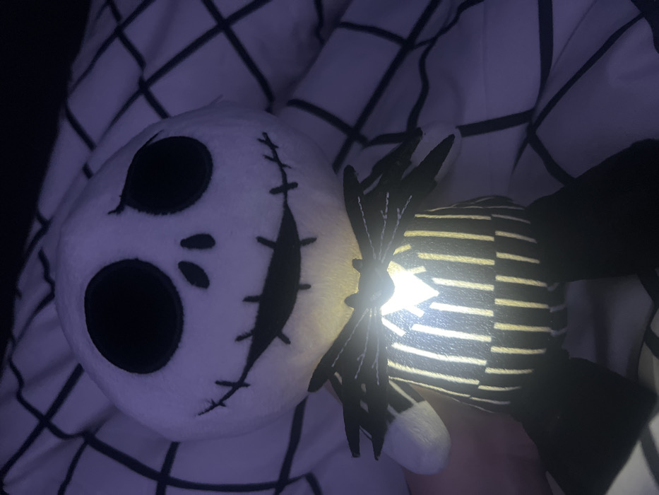 A plush toy resembling Jack Skellington lies against a checkered black and white pattern. The toy's head is white with stitched details forming a skeletal face, including large, black, round eye sockets and a stitched smile. The body has alternating black and white stripes, illuminated from within by a bright, internal light source, visible between its limbs. The scene is dimly lit, giving the image a soft, eerie glow.
