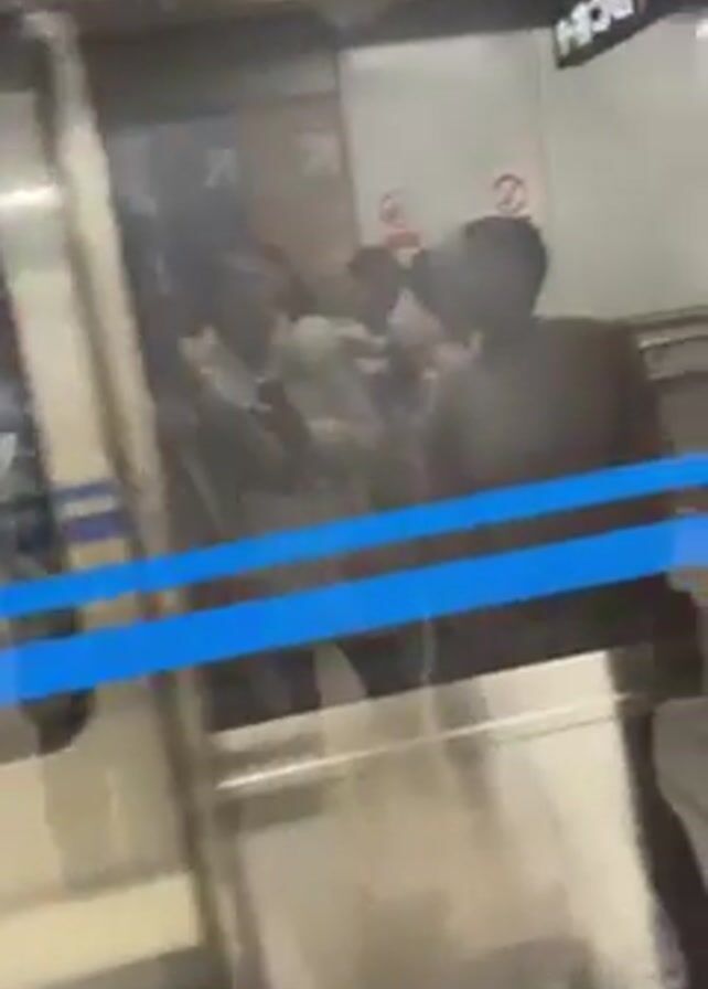 A woman in a beige coat and a black beanie is standing in a subway train, filming herself as the train pulls into a station