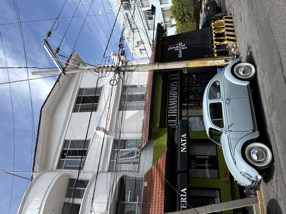A light blue Volkswagen Beetle is parked beside a building housing "ULTRAMARINOS EL NATA" and a seafood restaurant. The building has a red-tiled roof and green accents. A tall white building with multiple windows stands adjacent, crossed by numerous power lines extending from a utility pole. The sky is partly cloudy. A black SUV is parked behind the Beetle, near a stack of yellow and black ramps.