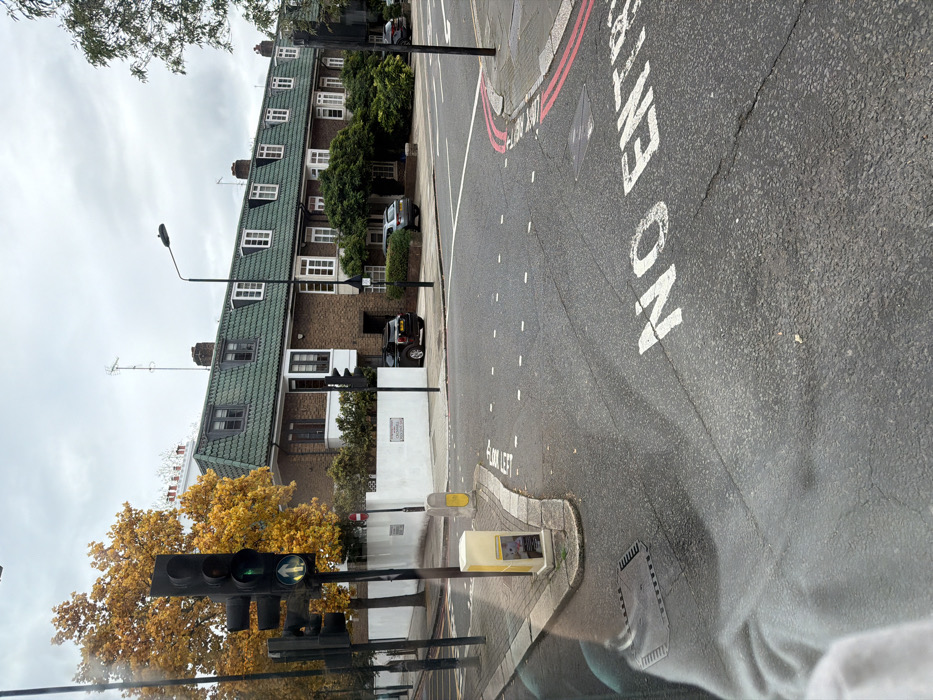 The image depicts an overcast daytime scene at a street intersection in St. John's Wood, London, United Kingdom, specifically at Avenue Road NW8. The foreground features a tarmac road with various white painted markings, including "NO ENTRY" prominently displayed on the asphalt, a "TURN LEFT" arrow and text, and dashed lines indicating lane boundaries. Red double lines are painted along the curb on the right, signifying parking restrictions. A metal storm drain cover is visible in the lower left. On the left side of the intersection, a pedestrian island with a curb features a yellow push-button signal box. A black traffic light pole stands at the corner, displaying a green upward arrow and a green left-turn arrow. Behind this pole, a large tree exhibits vibrant orange and yellow autumn foliage. A low white wall with a "No Entry" sign and a street sign indicating "AVENUE ROAD NW8 St. John's Wood" is visible behind the pedestrian island. The background is dominated by a row of multi-story residential buildings, likely townhouses, constructed from brown brick. These buildings feature distinctive green-tiled mansard roofs adorned with multiple white-framed dormer windows. Each residence has a small front garden or driveway area. A dark-colored SUV is parked in a driveway on the left of this building row, and a grey car is parked further down the street. Another dark-colored vehicle is partially visible on the far right. Black streetlights are positioned along the pavement. The sky is uniformly overcast. No people are visible; however, a partial reflection of a person and vehicle interior is present in the lower left quadrant of the image.