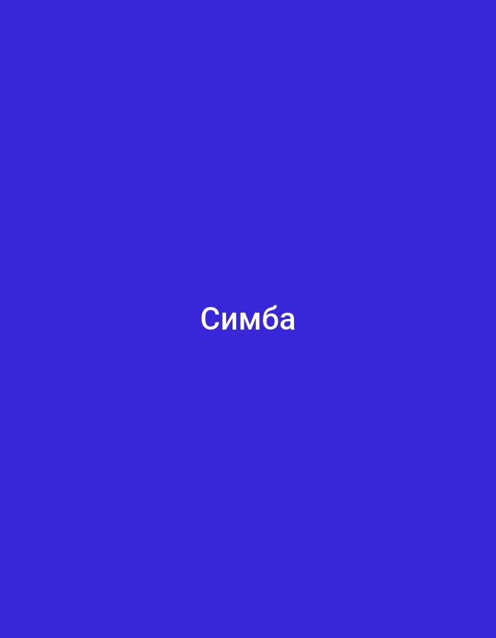 The image displays a minimalist digital graphic featuring a uniform, solid royal blue background. Centrally positioned on this background is the word "Симба" (Simba) rendered in white, sans-serif Cyrillic text. No individuals, physical subjects, objects, or discernable actions or interactions are depicted. The visual content of the image does not provide any specific geographical indicators or environmental elements to determine a physical location within the city of Vratsa, Bulgaria, or any other region.