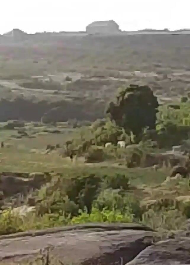landscape from a slightly elevated position. In the foreground, there are rocks and sparse greenery. The midground features a valley with more dense vegetation, including green bushes and patches of brown grass. In the far background, a distant hill or mountain range is visible against a pale sky. The camera pans slightly to the right.