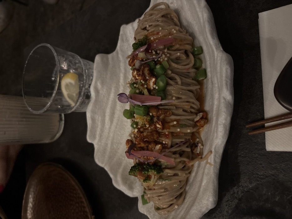 The image displays a close-up, top-down perspective of a dining table in what appears to be a dimly lit restaurant setting. A meticulously plated noodle dish, resembling soba or similar, is centrally presented on a white, shell-shaped ceramic plate. The noodles are arranged in an elongated, coiled bundle, garnished with chopped green onions, small green florets (broccoli-like), scattered white spherical grains, reddish-orange oil, golden-brown crispy elements, and delicate purple/pink slices or leaves. To the upper left of the plate, a portion of a textured, round, copper-colored dish is visible, alongside a ribbed glass containing a light-colored beverage. To the upper right, a clear, faceted glass tumbler holds water with ice and a lemon wedge. In the lower right foreground, a pair of dark wooden chopsticks rests on a white napkin, positioned next to a small, dark chopstick rest. The table surface is dark and textured. No individuals are visible in the frame. The specific location within Tel Aviv, Israel, cannot be determined from the provided visual information.