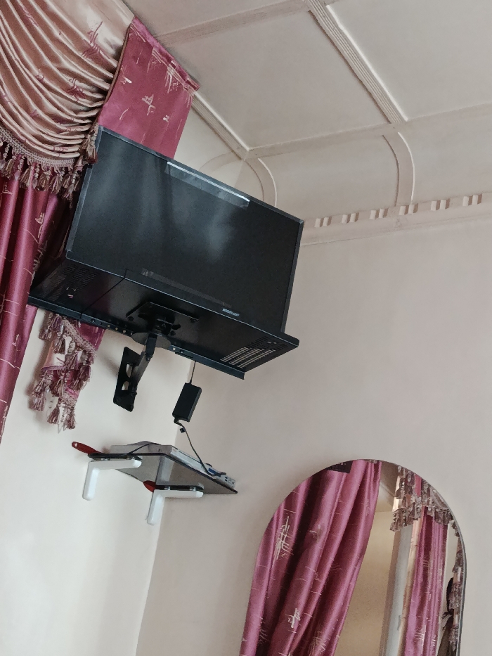 The scene depicts an interior room located in Khasanbay, Uzbekistan. A black Sony flat-screen television is mounted on a light beige wall using a black articulated wall bracket, angled slightly downward. Below the television, a small wall-mounted glass shelf with white brackets and red accents supports a black rectangular electronic device and associated cables. To the left of the television, a section of heavy drapes is visible, featuring an upper light-colored, pleated fabric and a lower maroon fabric with an abstract pattern and decorative tassels. The white ceiling incorporates recessed rectangular panels and decorative molding with dentil-like elements and curved sections. In the lower right of the frame, an unframed arched mirror reflects a portion of the maroon drapes and an indistinct, partial human figure.