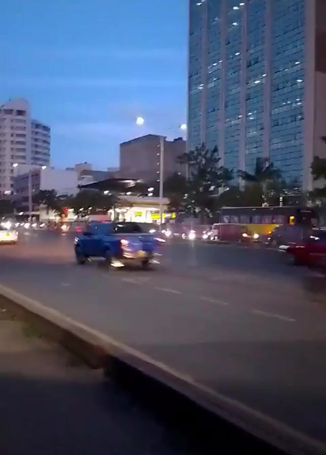 street scene at dusk. A tall building with many windows is visible on the right side of the frame. Several cars and motorcycles are moving along the road in front of the building. The sky is a deep blue, suggesting it is early evening. Street lights are illuminated, and the headlights of the vehicles are on. There is a sidewalk in the foreground, and some greenery is visible along the edge of the road.
