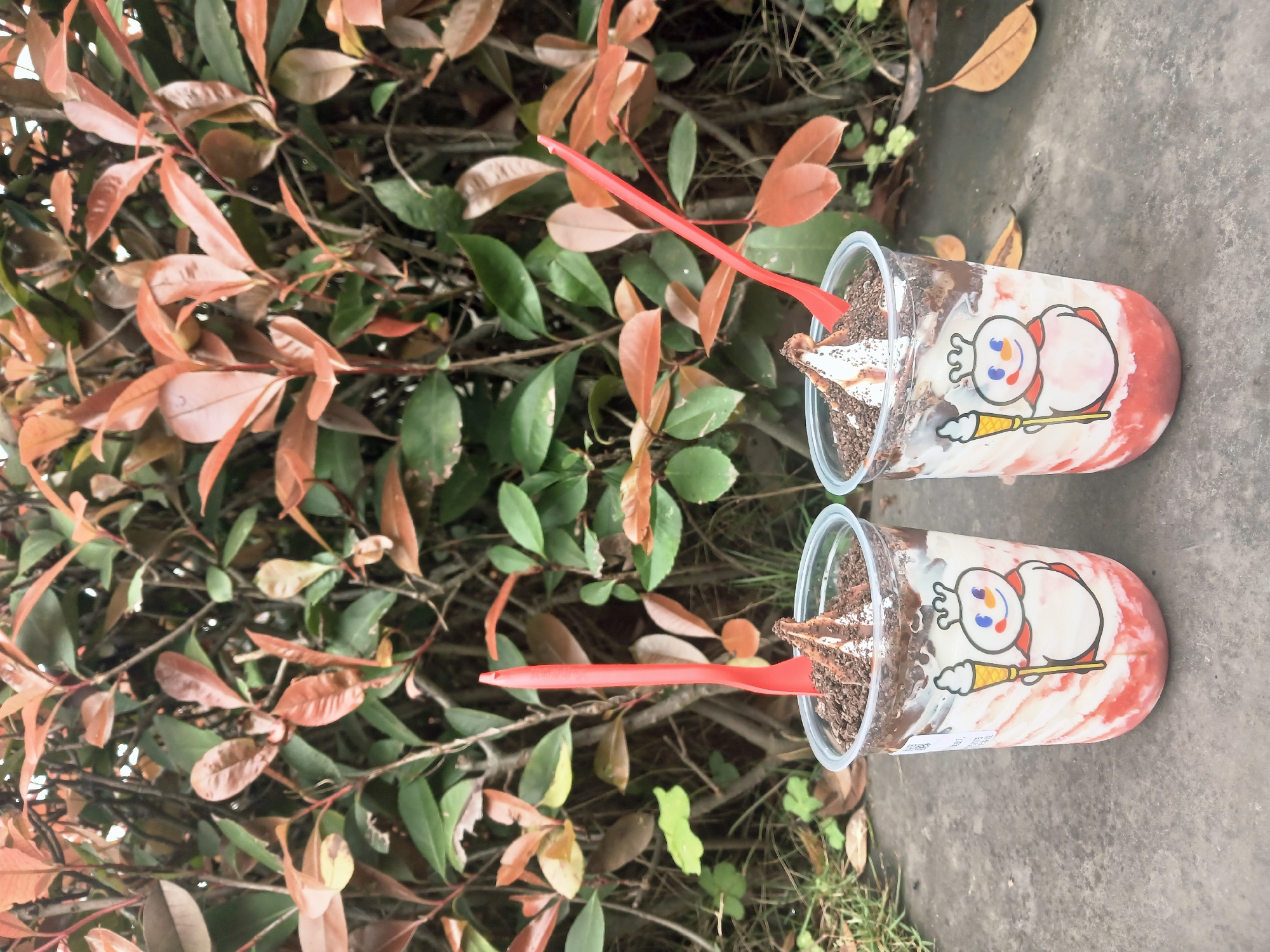 This image displays two identical clear plastic dessert cups situated on a mottled grey concrete surface in the Chongqing High-tech Zone, China. Each cup contains a layered dessert: a bottom layer of red fruit puree, followed by white soft-serve ice cream, a dark brown sauce, and a top layer of crushed dark cookie crumbs. A red plastic spoon is inserted upright into each dessert. The exterior of both cups features a white cartoon snowman graphic holding a yellow ice cream cone. The background consists of a dense growth of foliage, primarily bushes with a mix of dark green and reddish-brown leaves. Scattered reddish-brown leaves are visible on the ground immediately behind the cups. No individuals are present in the scene.