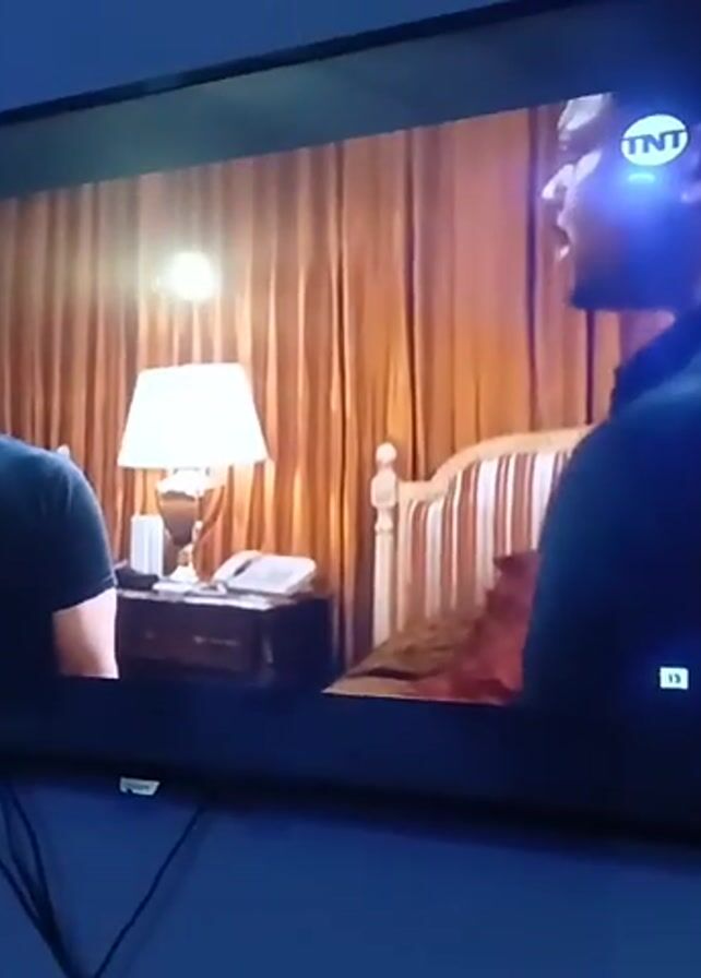 A television is mounted on a blue wall and displays a scene from a movie or show. On the screen, a man with dark hair, wearing a black t-shirt, is visible on the left side of the frame. He appears to be speaking or listening intently. To his right, partially obscured, stands another person. The background suggests a bedroom setting with a bed, nightstand, lamp, and draped curtains. The TNT logo is visible in the upper right corner of the screen. Several cables hang from the bottom of the television. The room in which the television is located has an arched decorative element on the wall to the left of the television.