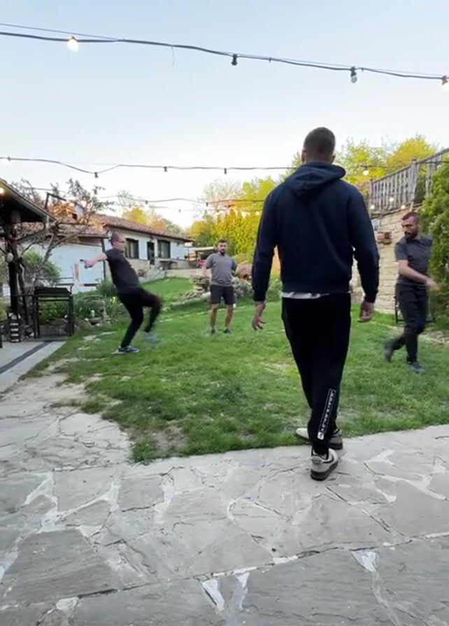 four men playing keep-ups with a soccer ball in a grassy backyard. The men are casually dressed. One man is wearing a black hoodie and black sweatpants with white stripes down the sides, and he is in the foreground. Another man wears a gray t-shirt and gray shorts, and a third is wearing a black t-shirt and black sweatpants. The fourth man wears a gray shirt and black pants. The backyard is bordered by a stone patio in the foreground, a stone wall in the background, and several buildings. String lights are hung above the yard. The sky is visible and a pale blue.