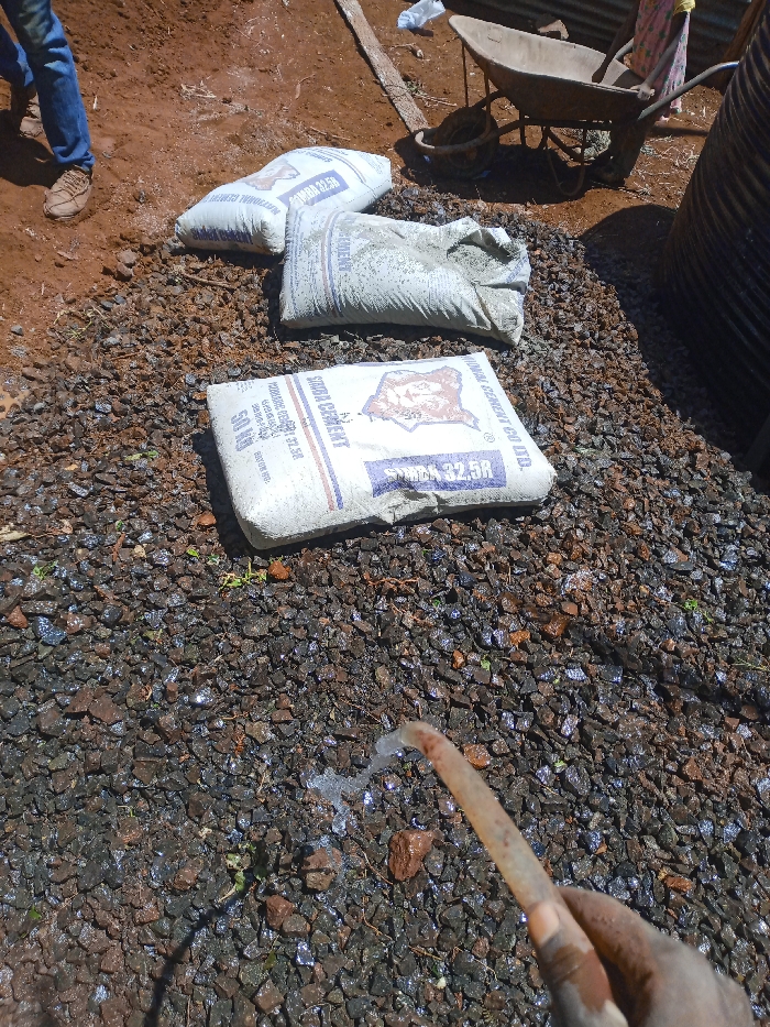 The scene depicts a ground-level view of a construction area in Kiangochi, Kenya. The foreground is dominated by a dark-skinned hand holding a translucent hose, from which a clear stream of water is being directed onto a dark, coarse aggregate surface. The aggregate, consisting of small, irregularly shaped stones, appears wet and reflects light. In the midground, three white 50 kg bags of "SIMBA CEMENT 32.5R" are stacked or laid on the aggregate. The foremost bag displays a logo featuring the map of Kenya. To the left, the lower legs and feet of a person wearing blue jeans and light brown shoes are visible on an area of reddish-brown soil. To the right, a metal wheelbarrow with a dark basin rests on similar reddish-brown soil. Behind the wheelbarrow, a portion of a large, dark, corrugated metal structure, possibly a water tank, is visible, along with a partial view of a person wearing a patterned fabric garment. A wooden plank lies on the dirt near the wheelbarrow. The environment is brightly lit, indicating daylight, and the combination of materials suggests preparation for concrete mixing or construction work.
