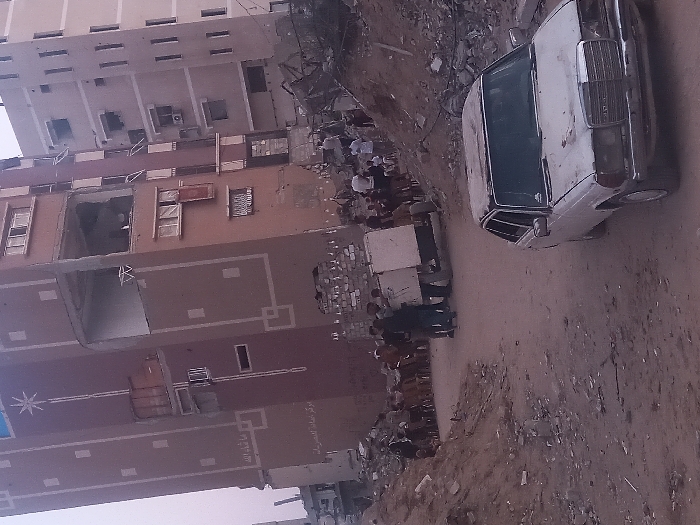 The image displays an urban street scene in Khan Yunis, Palestinian Territory, characterized by visible damage and debris. In the foreground, an older model white Mercedes-Benz sedan, exhibiting wear and dirt, is parked on an unpaved dirt road. The road is flanked by embankments of loose earth and scattered rubble. In the midground, a group of approximately fifteen individuals, primarily adults but including some children, are gathered on the dirt road, positioned around a small, white, wheeled trailer or cart. Beyond this group, a multi-story building with a light brown facade dominates the left background, showing extensive structural damage with exposed interior sections and missing external walls on its upper levels. This building features white decorative geometric patterns, a white star emblem near its roofline, and Arabic script on its lower facade, including "ما شاء الله". To the right of this structure, another multi-story, lighter-colored building is partially visible. The overall environment contains numerous scattered fragments of concrete, dirt, and construction debris.