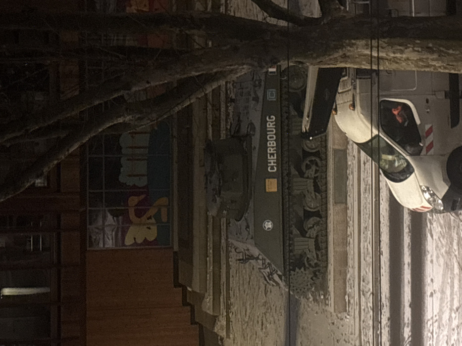 street scene at night, dominated by a vehicle that looks like a military tank with "CHERBOURG" printed on its side, partially obscured by tree branches