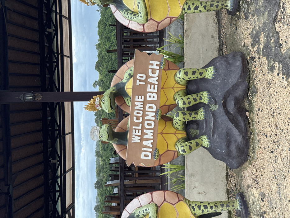 This image, taken in Pejukutan, Indonesia, displays a static outdoor scene featuring decorative elements and a natural backdrop under an overcast sky. The central focus is a group of three stylized turtle statues. Two central turtles, anthropomorphized with legs and arms, are depicted sitting on a dark, irregularly shaped rock formation. They jointly hold a brown, irregular wooden sign horizontally that reads "WELCOME TO DIAMOND BEACH" in white capital letters. The turtle on the left wears a white Balinese-style headwrap, while the turtle on the right wears a golden crown adorned with small red and pink floral accents. Both central turtles feature light green skin with dark spots, yellow plastrons, and brown carapaces with hexagonal patterns. Partial views of similar turtle statues are visible on the far left and far right of the frame, standing upright. Behind the statues, a low concrete barrier is visible to the left, and a line of short green plants runs along the base of a wooden fence or railing. Further back, under a large dark wooden support beam and a roof structure with a thatched or textured brown underside, are several empty wooden tables and chairs, indicating an outdoor dining or viewing area. An ornate metal lantern is affixed to the wooden support beam. The background consists of a dense, lush green forest or jungle under a light gray, cloudy sky. The foreground shows a ground composed of light brown gravel or dirt with some darker, possibly damp, patches. No people are visible in the scene, and no active interactions are occurring.
