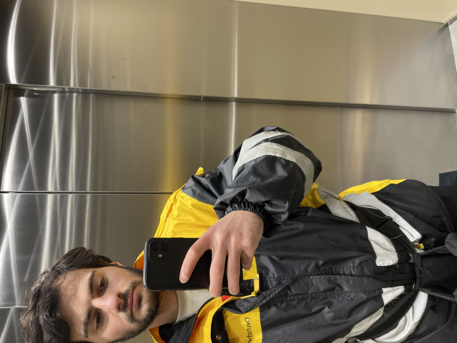 A male individual is observed taking a mirror selfie within an elevator. The subject, appearing to be in his 20s or 30s, has dark hair and a short beard. He is dressed in a black and yellow, full-body utility suit featuring grey reflective stripes on the arms and torso. The reversed text "Deutsche Post" is visible on the upper left chest area of the uniform. He holds a black smartphone, equipped with a dual-lens camera system, in his right hand, angled to capture his reflection in the polished metal surface. The environment consists of an elevator interior with brushed stainless steel panels displaying horizontal striations and reflective properties. The image provides no discernible visual information to pinpoint a specific location within Nuremberg, Germany.