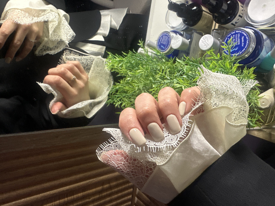 The image depicts an indoor scene in Nekrasovskiy, Russia, featuring a close-up of a person's hands and their reflection in a mirror. In the immediate foreground, a left hand is presented, exhibiting long, neatly manicured fingernails painted in a light beige or nude color. This hand emerges from a dark sleeve and is adorned with an elaborate white lace cuff featuring intricate patterns. Directly behind the hand, a vibrant green artificial plant resembling a fern is visible. To the right, a mirror reflects the person's right hand, which appears to be holding a dark-colored smartphone, indicative of a self-portrait (selfie) being taken. The reflected right hand also displays a delicate ring with a small, circular stone on the ring finger and a matching white lace cuff on its sleeve. The reflection further reveals a portion of the person's upper torso, clad in a dark garment, possibly a jacket or blazer, over a white ruffled blouse or shirt. Arranged on a surface below the reflection, several cosmetic or personal care products are visible, including multiple blue jars (one labeled "Farmstay Collagene ALL-IN-ONE HYDROP GEL"), various bottles with pumps or caps, and containers with partial labels such as "Juliana Grace" and "k-i-k-i". The background to the far left of the foreground hand shows a warm-toned, vertically grooved wooden surface. The lighting is artificial, creating distinct highlights and shadows.