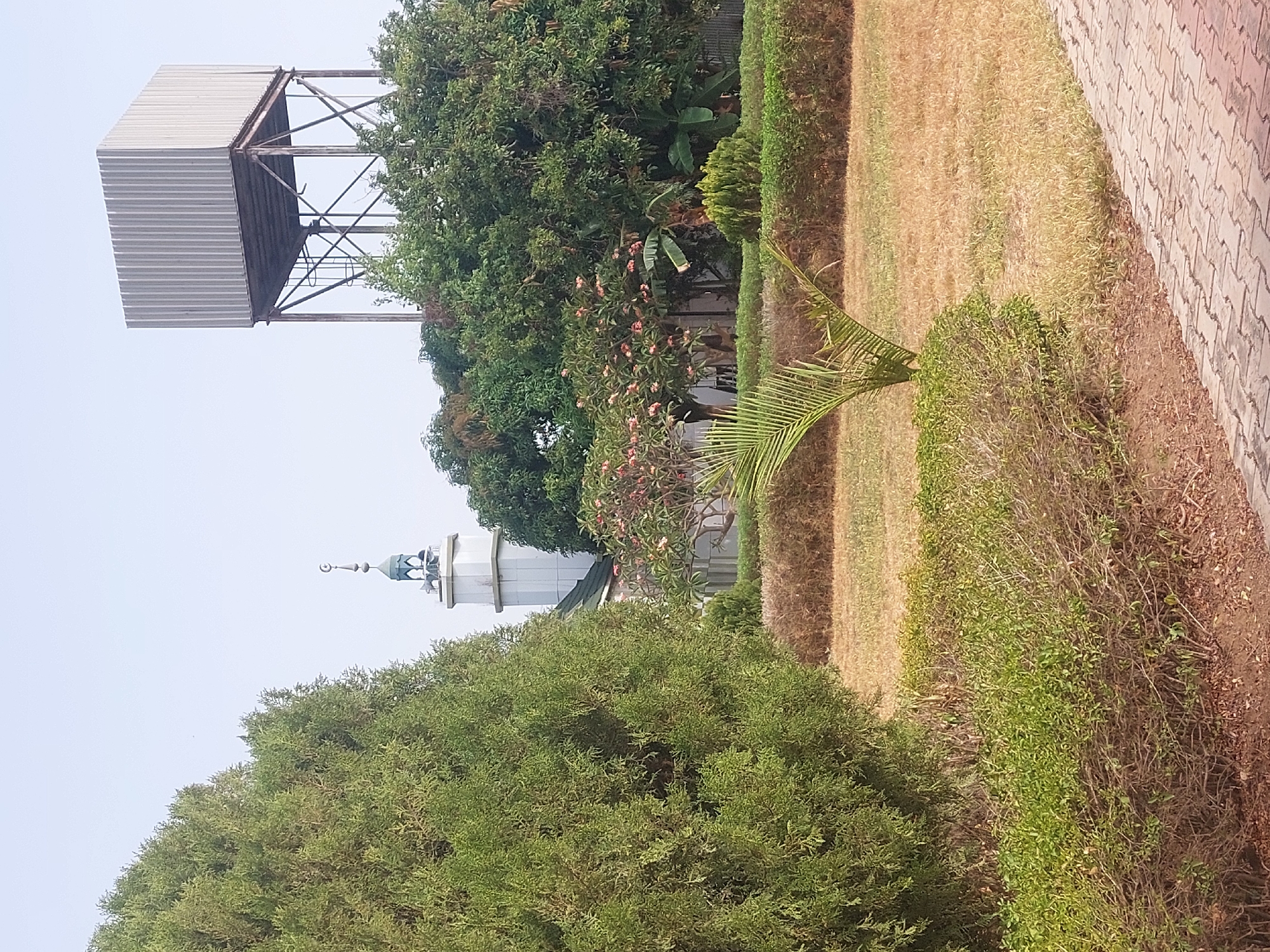 n outdoor scene in Jos, Nigeria, featuring a mix of natural and man-made elements. A water tower stands prominently in the background, with a white and green mosque minaret visible behind lush green trees and flowering plants. A neatly trimmed hedge borders a grassy area, transitioning to a paved walkway. The overall environment suggests a well-maintained park or garden setting. No people are visible in the frame.
