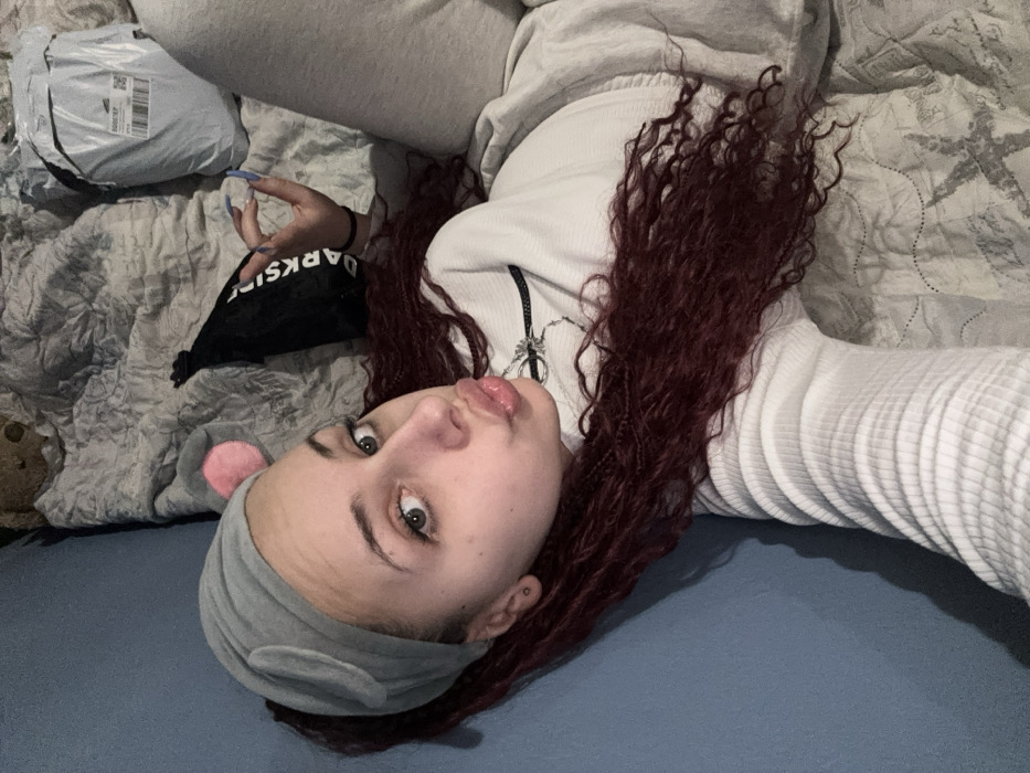 A young female subject is depicted in a close-up, diagonal orientation, lying on a surface covered by a patterned grey comforter, adjacent to a plain blue wall. The scene is located in Varna, Bulgaria. The subject has long, dark reddish-brown, tightly curled hair and light-colored eyes. She is wearing a grey headband featuring two attached ears, one displaying a pink inner lining. A small stud earring is visible in her left earlobe. Her lips are pursed forward, directed towards the viewer. She is dressed in a light-colored, ribbed long-sleeved top and light grey sweatpants. A black choker-style necklace with a silver-colored ring and a small dangling charm is present around her neck. Her right hand is raised and bent at the wrist, displaying long, blue-colored fingernails, and appears to be forming a distinct hand gesture. In the background, on the comforter, a black bag with "DARKSIDE" text printed in white is visible. Adjacent to it, a white packaged item wrapped in plastic is present, featuring a shipping label with partially visible text, including "BOOST..." and a barcode. The head of a brown teddy bear is partially visible in the upper background, resting on the comforter. The subject is looking directly towards the camera.