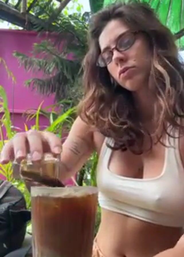A woman with shoulder-length curly brown hair and wearing oval-shaped eyeglasses is seated outdoors. She's wearing a white sports bra and tan shorts. She pours liquid from a small glass into a tall glass filled with ice, coffee, and milk and containing a green straw. The background includes greenery, a pink wall, a thatched roof, and white cloth hanging from the roof. A black bag sits to her left.