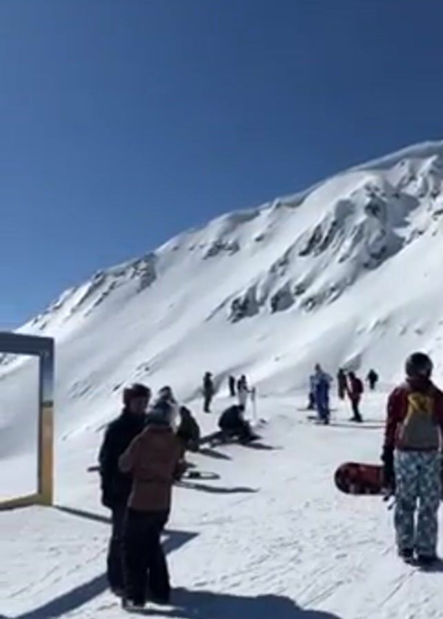 sunny day on top of a snow-covered mountain. Many people are walking and standing around on skis or snowboards. One person walks towards the camera with a snowboard. The video pans to the right to show people posing in front of a frame. The video continues to pan to show a large, spherical monument with the colors of the Bulgarian flag on it. The background shows a mountain range covered in snow.