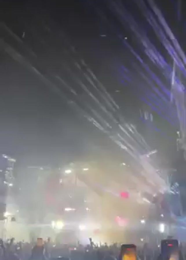 A music concert at night features a large crowd of people facing a stage. The stage is equipped with bright white and blue spotlights and laser beams that shoot out into the sky. Some attendees hold up their phones to record the performance. There is fog or smoke in the air, enhancing the visual effect of the lights.