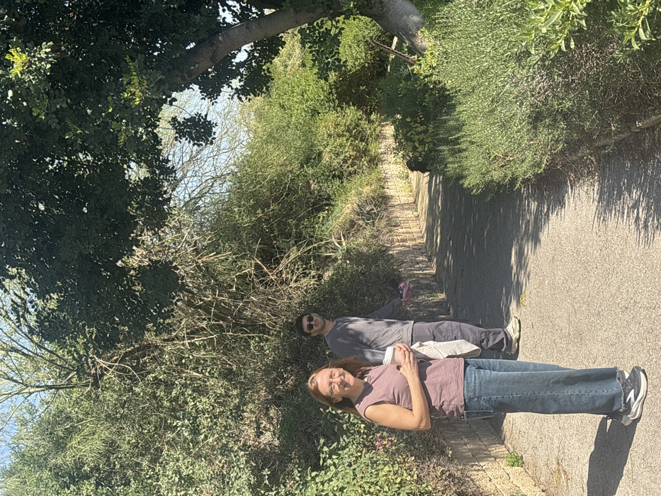 Two individuals are positioned on a paved pathway flanked by dense green vegetation under clear daylight conditions