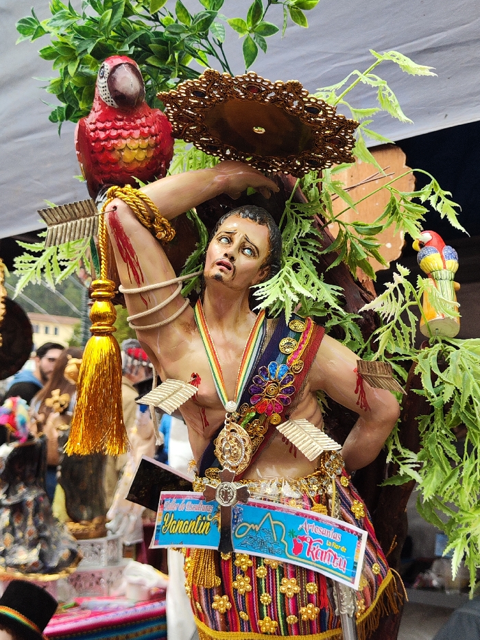 A statue of a saint or martyr is adorned with arrows, fake foliage, and a red and yellow parrot. A rainbow sash drapes across his chest, accessorized with a golden cross and a decorative medal. Two small signs, "Yanantin" and "Artesanias," are pinned to his ornate skirt. A golden tassel hangs from his bound arm. The background reveals a crowd of people and a marketplace setting.