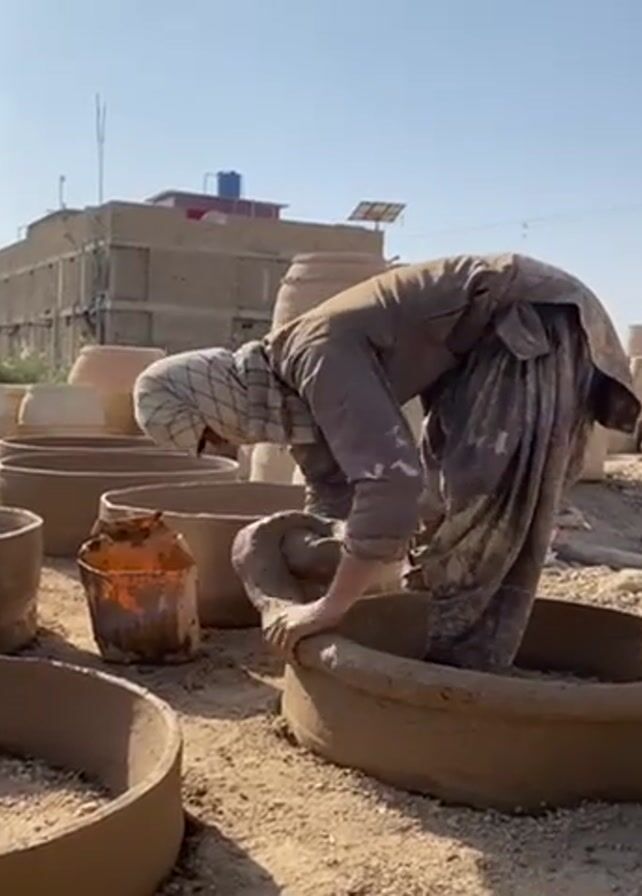 A person wearing a headscarf and long-sleeved shirt works on a large clay pot outdoors in a bright, sunny environment