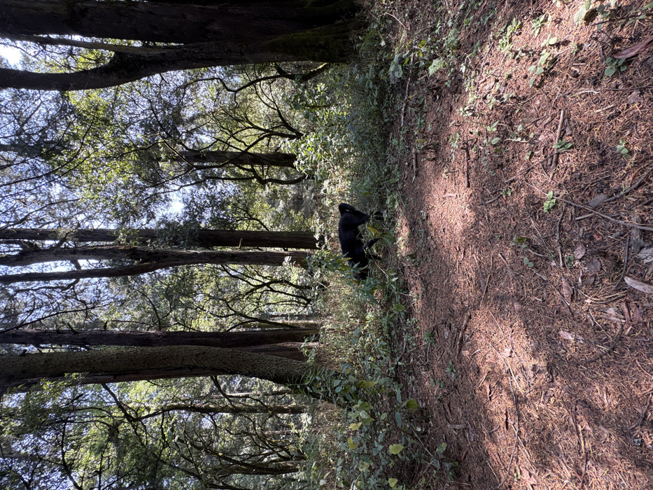 A forested outdoor scene in Unknown, Mexico, is depicted during daylight hours. The ground is covered with a mixture of reddish-brown pine needles, fallen leaves, and sparse green undergrowth, illuminated by dappled sunlight filtering through the tree canopy. A medium-sized black canine, consistent with a domestic dog, is positioned in the midground, oriented towards the left, with its head lowered into the dense green vegetation, appearing to sniff the ground. Tall, slender tree trunks, consistent with pine or conifer species, are visible throughout the background, surrounded by various green foliage and branches. No human subjects are present.