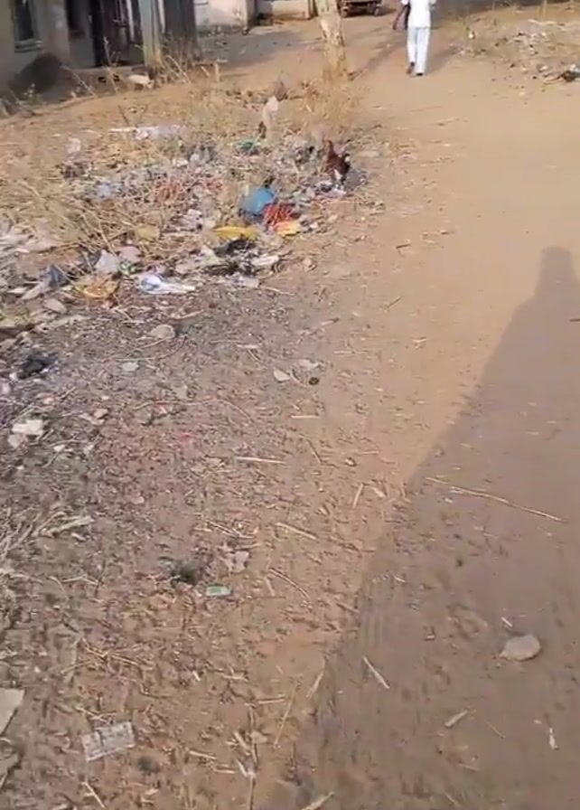 dirt road in a residential area. There is trash strewn along the side of the road and in the yards. A person in white clothing is walking away from the camera down the road. A rooster is also visible in the video. There are houses on both sides of the road, some with trees in front of them. The shadow of the person filming is visible on the road.