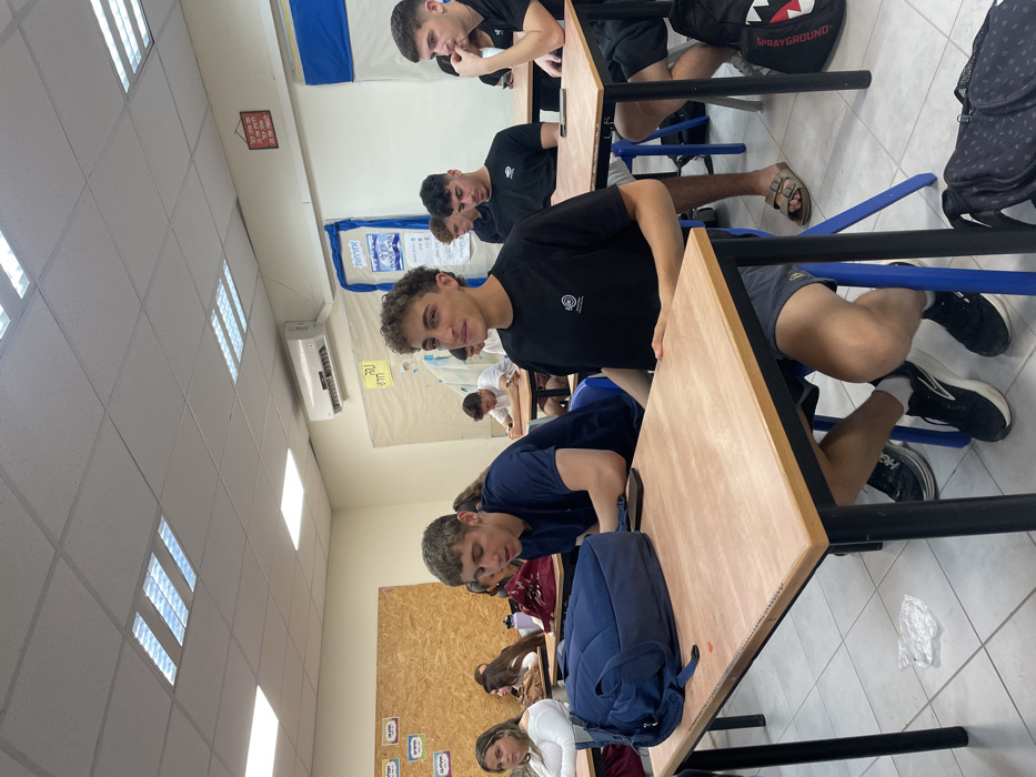 The image depicts a classroom in the city of Unknown, Unknown, occupied by multiple individuals, primarily young adults or teenagers. The environment features light-colored walls, a suspended ceiling with square acoustic tiles, and recessed fluorescent lighting fixtures. A white wall-mounted air conditioning unit is visible on the upper right wall. The floor is tiled with light-colored square tiles. Various posters and charts displaying Hebrew text are affixed to the walls, including a large corkboard on the left side of the room. Desks are constructed with light-colored wooden tops and black metal frames, paired with blue plastic chairs. In the foreground center, a young male with curly brown hair, wearing a black short-sleeved t-shirt and dark shorts, is seated at a desk, looking directly at the camera with a slight smile. His hands rest on the desk. He wears black and white athletic shoes. To his left, another young male with short brown hair, wearing a dark blue short-sleeved t-shirt, is seated at an adjacent desk. A dark blue backpack rests on his desk, next to a black smartphone. In the middle ground on the right, a young male with short dark hair, wearing a black t-shirt and dark shorts, is seated. He wears brown open-toed sandals. A black backpack with a white shark graphic is positioned on the floor beside his chair. Approximately ten to fifteen individuals are visible in total, all seated at desks. Most individuals in the background are looking downwards or away from the camera, though some faces are obscured. Two females are partially visible on the far left, one with blonde hair wearing a white top. A small, clear plastic bag is visible on the floor beneath the foreground left desk.
