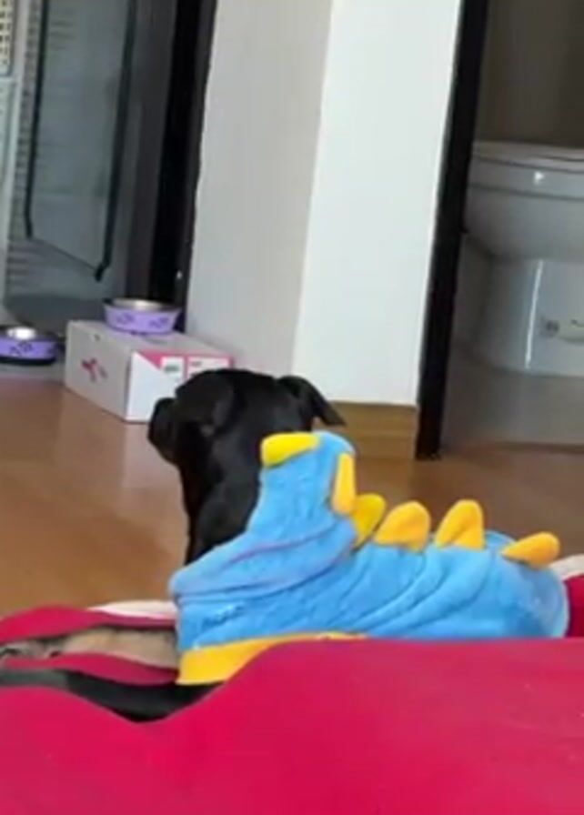 black dog lying on a red dog bed with a blue and yellow dinosaur-shaped towel or garment draped over its back. The dog is facing away from the camera initially, then turns its head to look towards the camera. In the background is a wooden floor, a white and black sliding door, and a partially visible white toilet in an adjacent room. Dog bowls and a small box are also visible near the sliding door. The dog appears relaxed but observant.