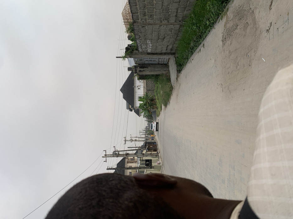 A slightly skewed perspective shows a road stretching into the distance, flanked by buildings and vegetation. The road appears to be paved with blocks. Utility poles line the left side, carrying electrical wires. A white vehicle is visible further down the road. The sky is overcast. In the foreground, part of a person's head and shoulder are visible, suggesting a first-person view. The photo seems to be taken on a cloudy day in a residential area.