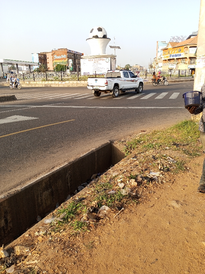 The image depicts a street scene in Dadi Riba, Nigeria, specifically at a roundabout featuring a large monument. In the center of the roundabout is a white monument with a prominent black and white soccer ball atop a flared pedestal. A sign on the pedestal reads "NEW KASUPDA." The roundabout is encircled by a metal fence and contains sparse green landscaping. In the middle ground, an asphalt road with white pedestrian crosswalk markings and a yellow center line runs horizontally. A white arrow painted on the road indicates a left turn. A white four-door pickup truck with a bed cover and dark wheels is positioned on the road, facing away from the viewer. Two motorcycles are visible: one on the far left traveling left, and another in the middle ground, near the crosswalk, traveling right with two occupants. The background features various commercial buildings. On the left, a petrol station canopy is visible. On the right, multi-story buildings with colorful facades and signage, including "Foam," are present. In the foreground, a concrete drainage ditch runs parallel to the road, extending from the bottom left towards the center. The ditch contains accumulated debris and refuse. Adjacent to the ditch, on the right, is a dirt shoulder covered with dry vegetation and a significant amount of litter, including plastic bags and other discarded materials. A person's lower body, including legs and a visible sandal on the right foot, is partially visible on the far right, holding a dark blue, rectangular plastic basket. The overall lighting suggests daylight conditions.