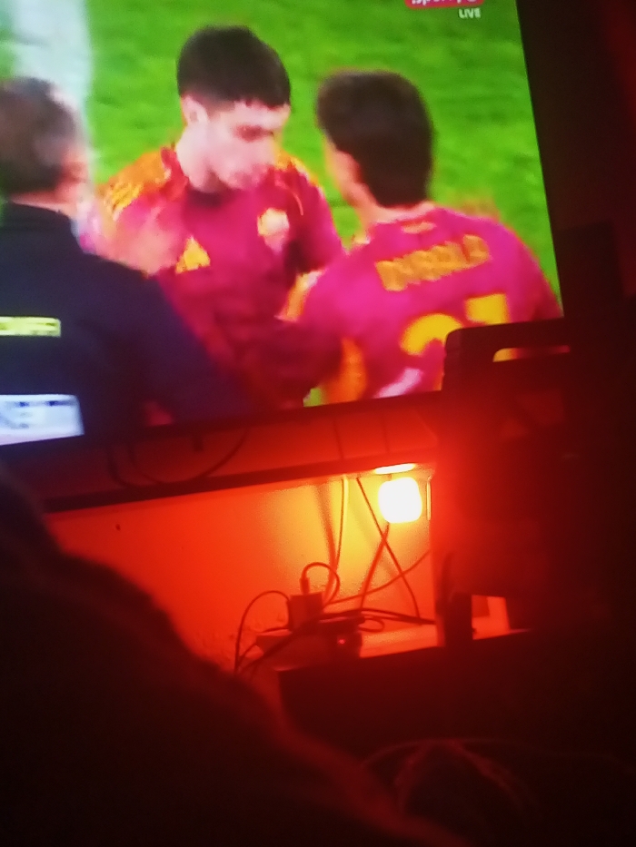 A television displays three soccer players in red uniforms on a green field. The player in the center faces forward, while the player on the right has "DYBALA" and the number "21" on his back. A person in dark clothing stands on the left. Below the television, a shelf contains electronic devices and various cables. An orange light illuminates the shelf. The scene appears to be viewed from a low angle, with part of a person's body visible in the foreground, suggesting they are seated and watching television.