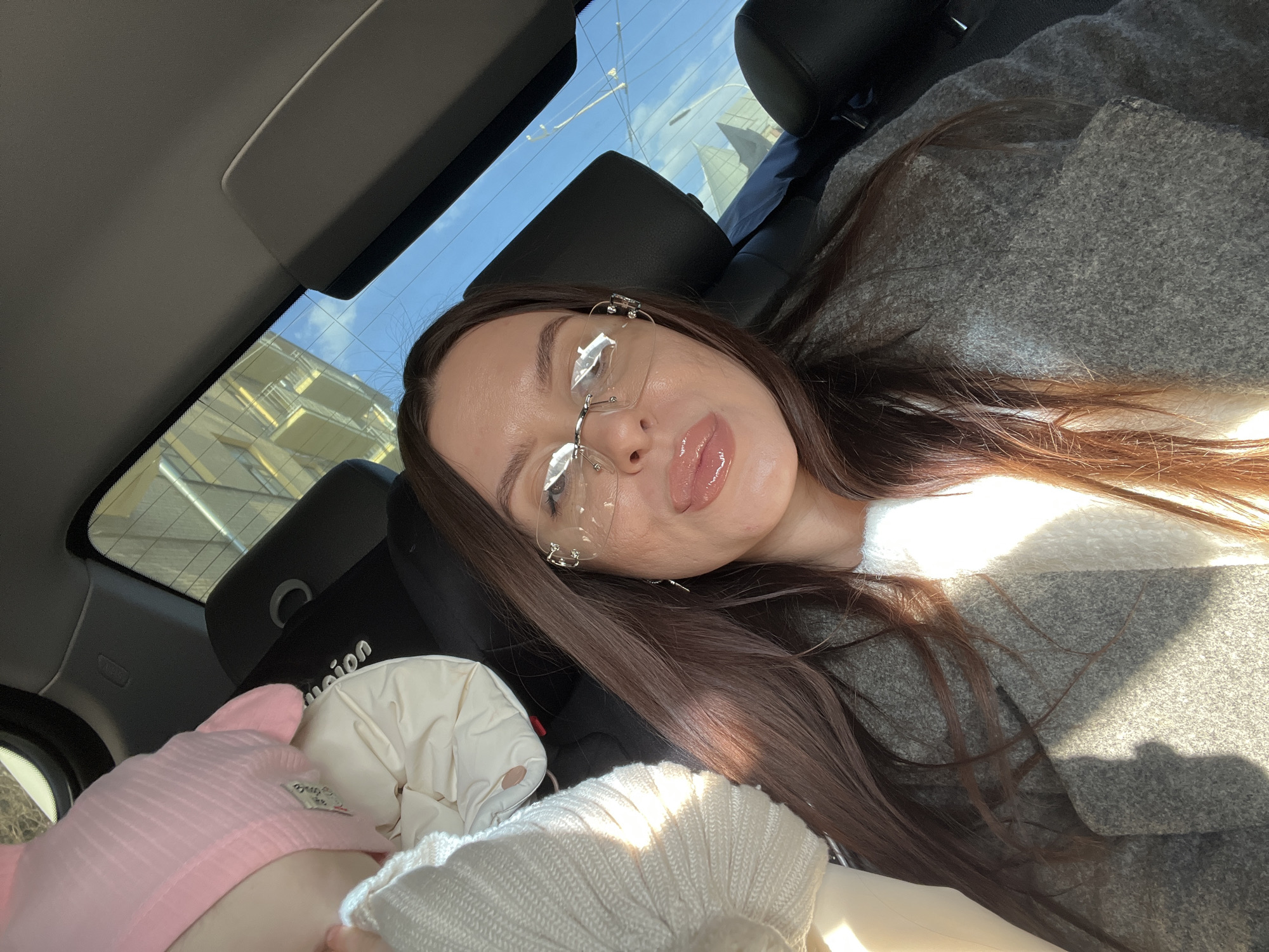 An indoor selfie captures a woman and a child in the backseat of a car during daylight hours