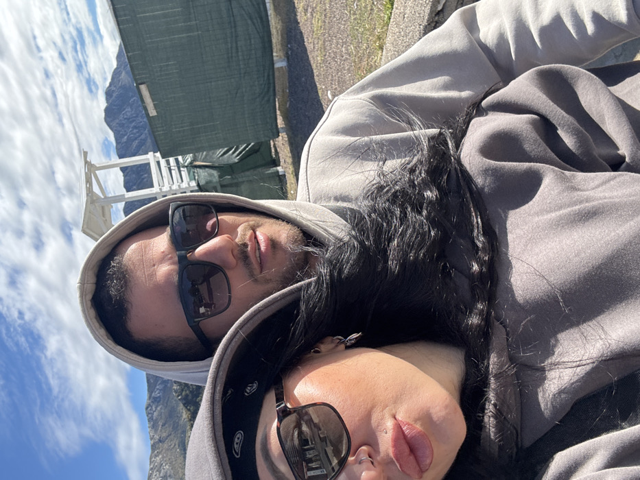 Two individuals, a male and a female, are depicted in an outdoor setting in Boreti, Montenegro. The male, positioned on the right, has a light beard/stubble and wears a light-colored hooded sweatshirt with the hood up and dark-framed sunglasses. The female, positioned on the left and closer to the camera, has long dark hair and wears a darker hooded sweatshirt with the hood up, a dark bandana visible beneath, dark-framed sunglasses, and visible facial piercings (nostril and philtrum) with an earring in her left ear. Both individuals' faces are oriented towards the camera, suggesting a self-portrait. The female's head is positioned close to the male's shoulder area. In the midground, a white wooden elevated structure, consistent with a lifeguard chair, is visible to the right of the individuals. Adjacent to this structure are multiple dark green tarp-covered structures. The ground in the midground and foreground consists of dry earth and sparse vegetation, with a low concrete barrier visible in the immediate lower foreground. Mountains rise in the distant background under a partly cloudy blue sky.