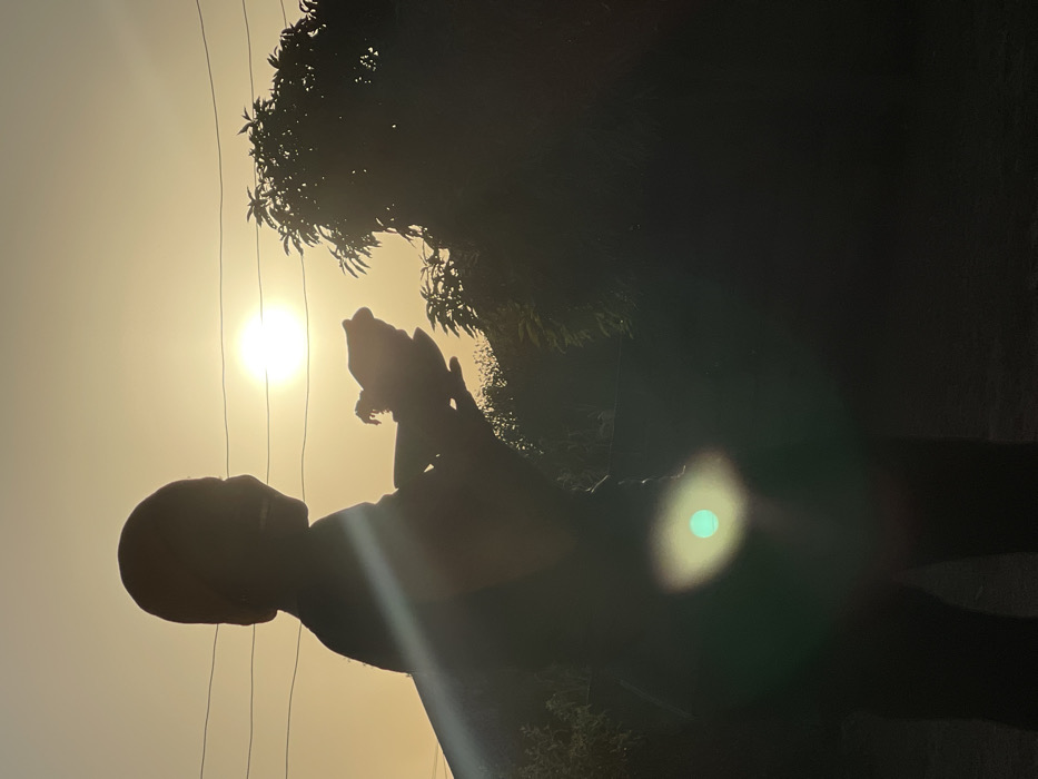 An outdoor scene in Jos, Nigeria, captured during sunset or sunrise. The image presents a prominent silhouette of a person, appearing to be a child or young adult, positioned in the left-midground. The individual is angled slightly right, with their head in profile exhibiting a discernible smile. They are holding a small, indistinct object, consistent with a chick or small animal, cupped in both hands at approximate waist height. The background consists of a hazy, orange-yellow sky containing a bright, circular sun positioned above the horizontal center. Multiple thin, dark horizontal lines, indicative of utility wires, traverse the sky above the sun. Dark, silhouetted foliage, consistent with bushes or trees, is visible along the right side of the frame and in the background. A distinct green-blue circular lens flare is present in the lower-left quadrant, accompanied by additional linear lens artifacts.