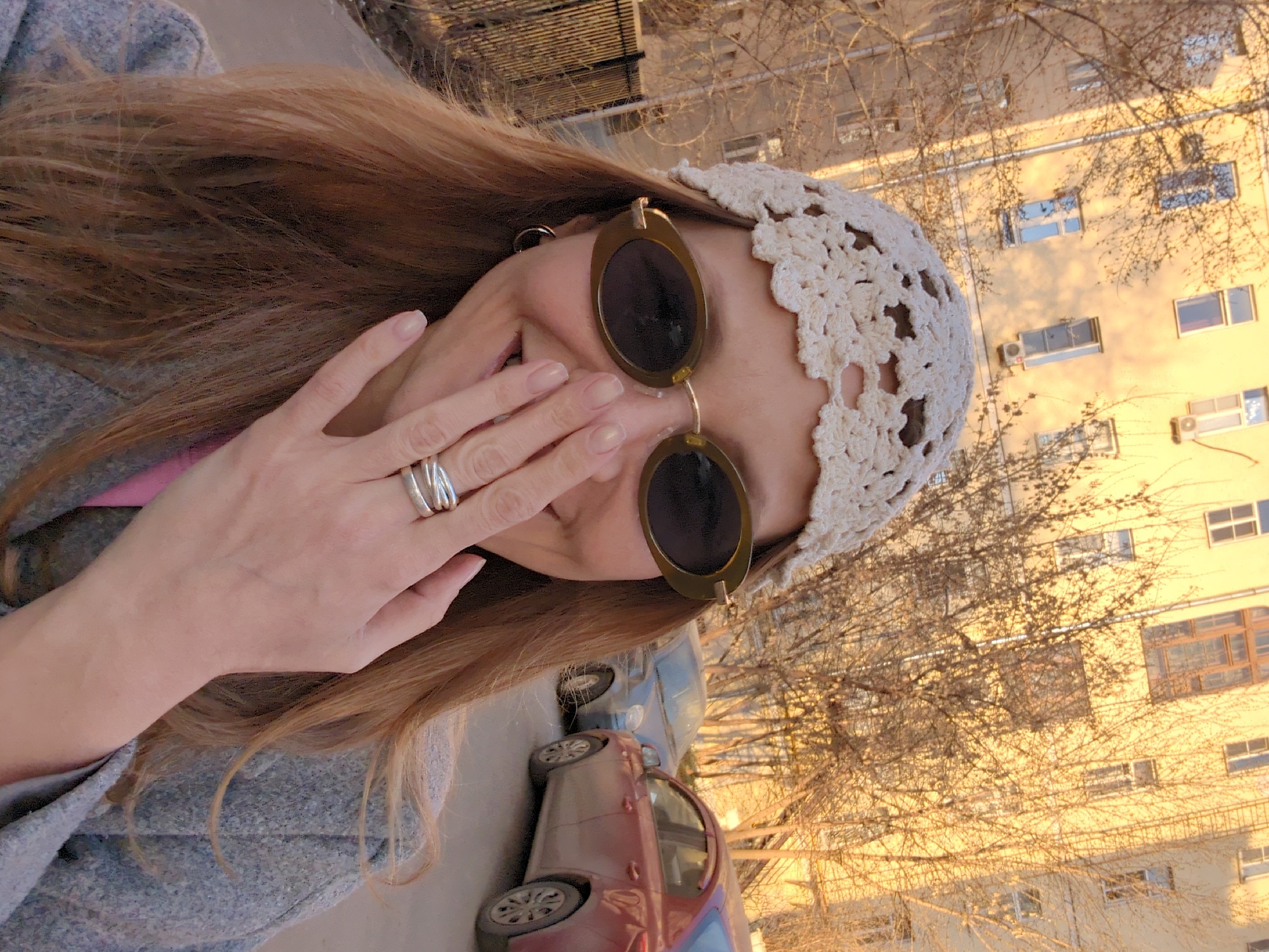 A woman wearing a white crocheted head covering and oval sunglasses obscures her face with her hand in an outdoor selfie. On her hand are multiple silver rings. Behind her are bare tree branches, an apartment building in Moscow, Russia with visible windows, and cars in a parking lot.