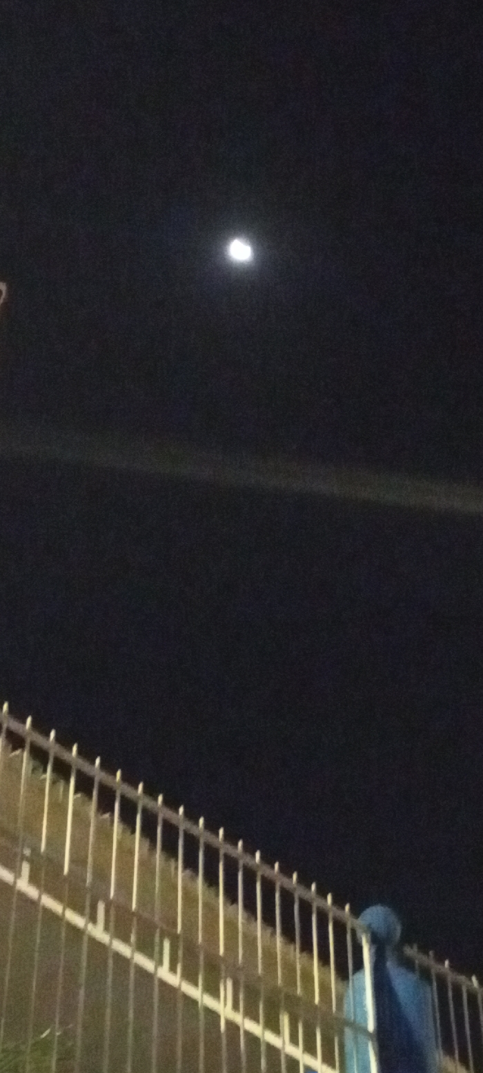 Against a stark night sky, a celestial orb shines brightly, its shape subtly suggesting a crescent phase. A hazy band stretches across the middle ground, adding depth to the scene. Below, a metal fence with vertical bars creates a rhythmic pattern, partially obscuring a blue object in the foreground. The overall composition is simple, emphasizing the stark contrast between light and dark elements.
