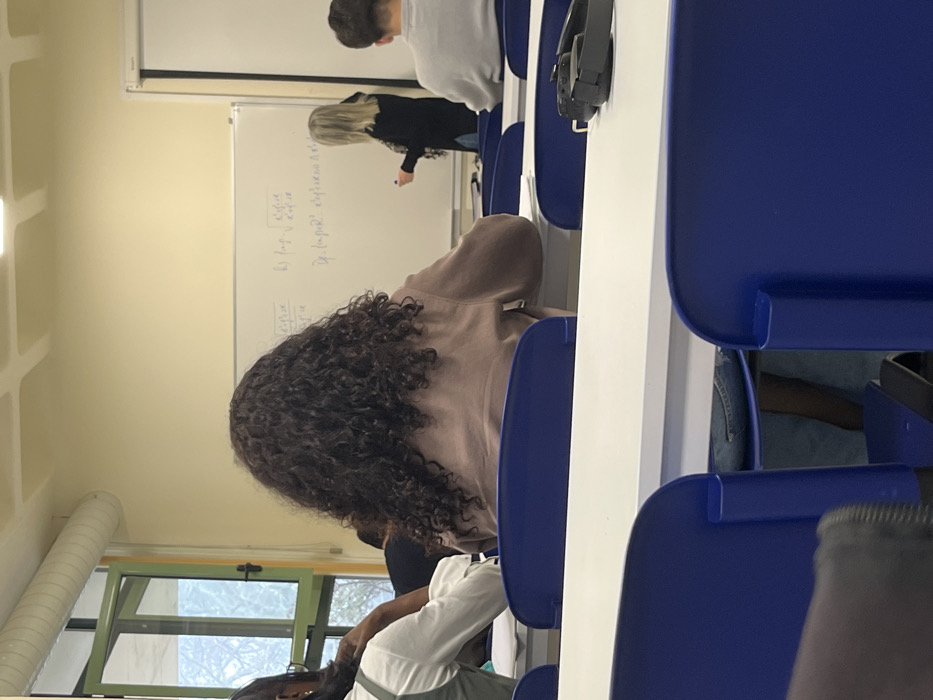 This image depicts the interior of a classroom, likely situated within the University of Trás-os-Montes and Alto Douro (UTAD) in Vila Real, Portugal. The room features light yellow walls and a ceiling with square recessed panels. At the front of the classroom, a large white board is visible, displaying handwritten mathematical equations, including expressions involving logarithms and roots, written in dark marker. A blonde-haired woman, dressed in a dark long-sleeved top and a patterned scarf, stands to the right side of the whiteboard, holding a dark marker in her right hand, actively instructing or writing. Four individuals are visible from behind, seated in blue chairs at white-topped desks, facing the front of the classroom and the instructor. In the central foreground, a person with long, dark, curly hair, wearing a light brown long-sleeved top, occupies a prominent position. To their left, the back and left arm of another student, wearing a light-colored top, are partially visible. To the right, the back of a third student, wearing a light grey long-sleeved top, is observed. Black over-ear headphones rest on the desk immediately in front of this student. The lower legs of a fourth person, clad in denim, are partially visible beneath the desk in the central foreground. On the left side of the classroom, a large window with green framing is partially open, revealing blurred green foliage outdoors. To the right of the white board, a rolled-up projector screen is affixed.