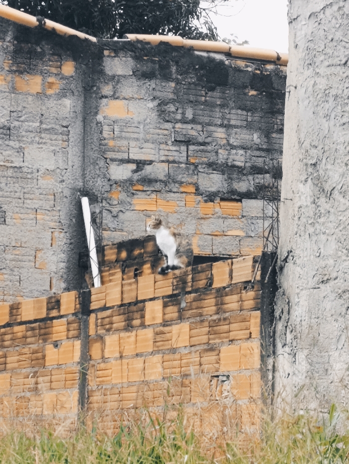- "The scene, located in Iperó, Brazil, displays a bicolored domestic cat seated atop a weathered masonry wall" by FM-ePb6o2, licensed under CC BY 4.0