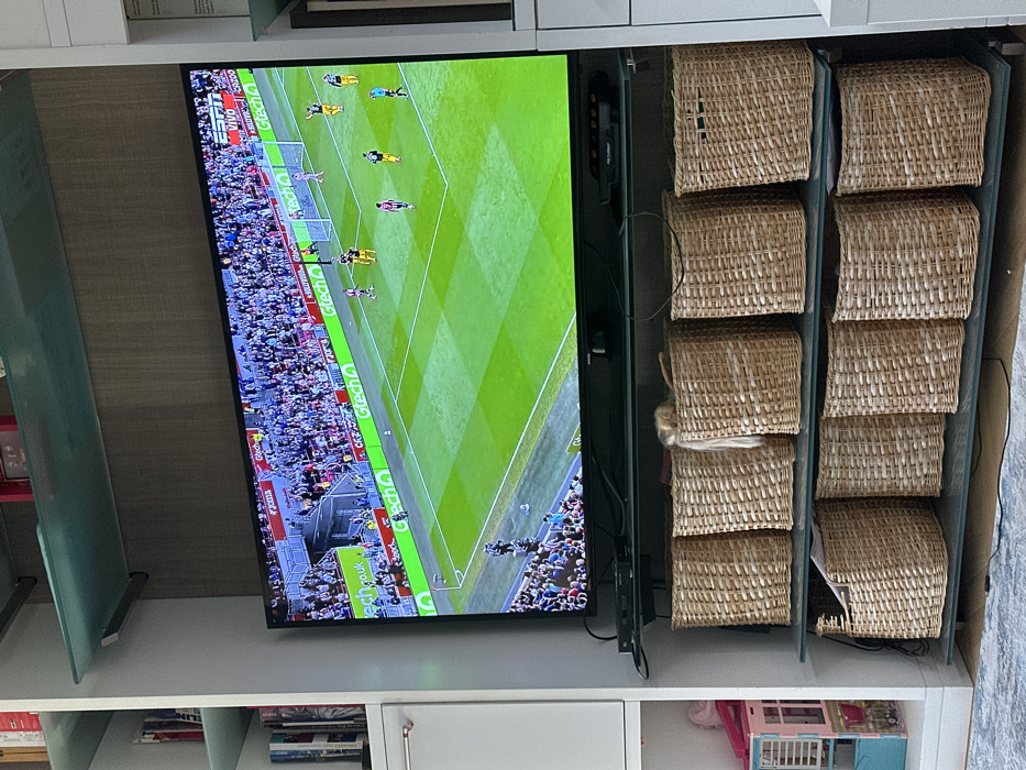 This image captures a detail of an indoor entertainment area in Lo Barnechea, Chile, focusing on a television screen and storage unit. A large, flat-screen television is centrally positioned, displaying a live soccer match from an outdoor stadium. The on-screen action features numerous players in varied team kits (predominantly black/yellow, and red/white striped) on a green grass field with white markings. Spectators fill the stadium stands in the background, behind advertising boards displaying "Gtech," "Joma," "Hollywoodbets," and "Cazoo." The "ESPN VIVO" logo is visible in the top right corner of the screen. The television is integrated into a multi-tiered shelving unit with a light gray, textured back wall. Above the TV, a clear glass shelf holds several red objects, and to its left, vertical shelves contain books. Below the television, a black media device sits on a clear glass shelf. Directly beneath this, two rows of woven wicker baskets are neatly arranged on glass shelves; the top row contains six baskets, with one revealing a blonde-haired doll. The bottom row holds five baskets. To the far left, a white shelving column includes a small pink and blue toy structure. A light-colored patterned rug is visible on the floor in the foreground. No individuals are visible in the room.