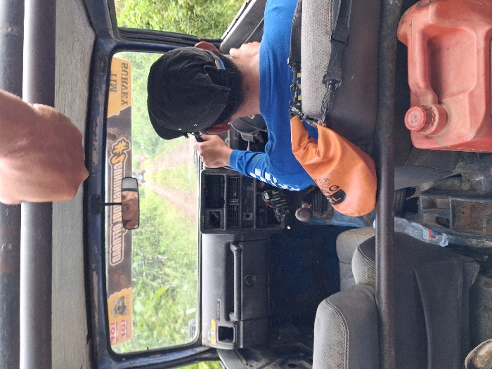 Inside a vehicle, a person wearing a blue long-sleeved shirt and a black cap is driving. The driver has one hand on the steering wheel. An orange bag hangs from the seat. A red gas canister sits next to the driver. A water bottle is seen by the seat. The vehicle is on a dirt road surrounded by green vegetation. Another vehicle is visible in the distance through the windshield.