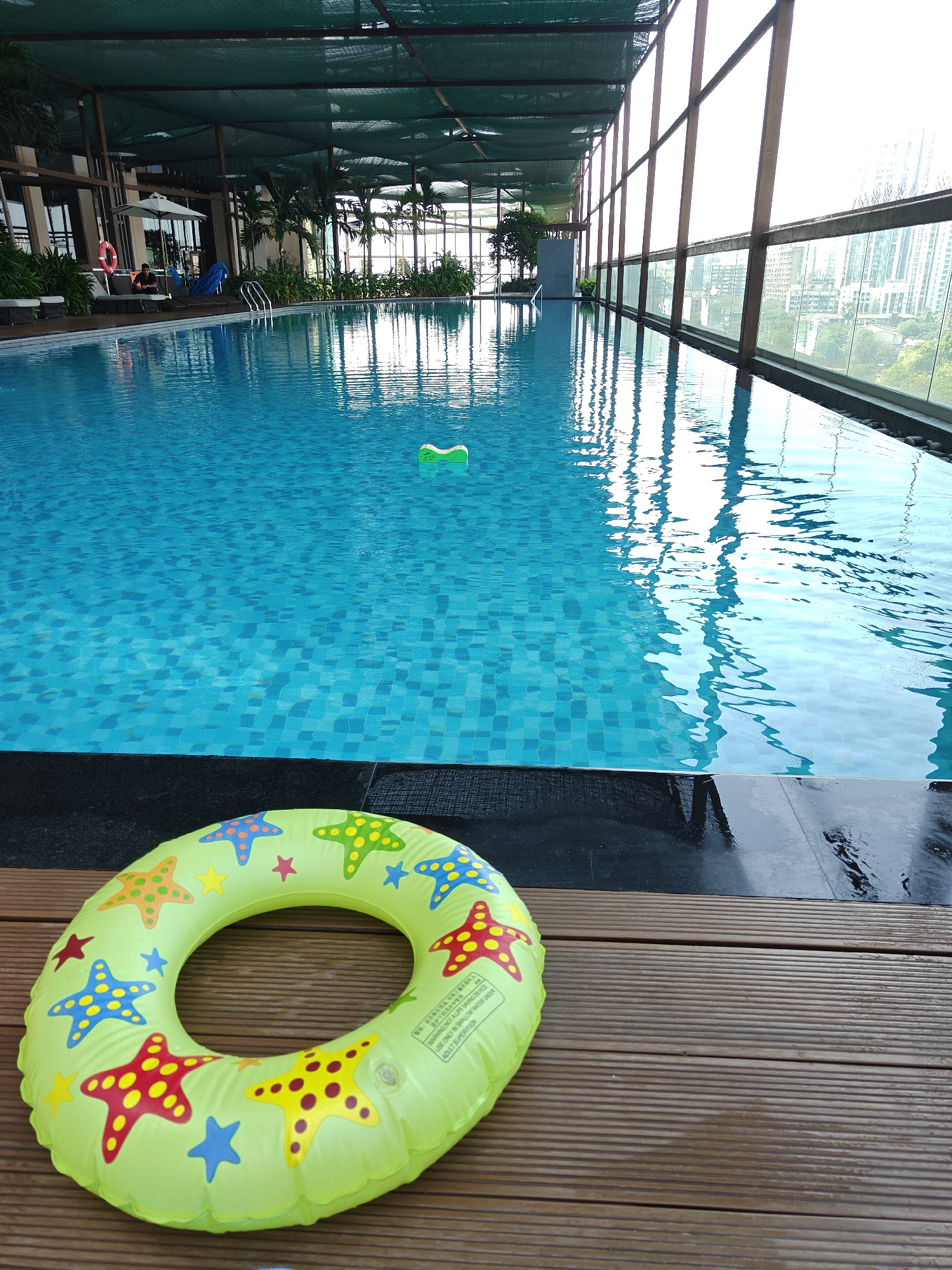 The image displays an elevated swimming pool facility located within the urban landscape of Mumbai, India. In the immediate foreground, a deflated, light-green inflatable swim ring, patterned with multi-colored starfish and small stars, rests on a wet, grooved wooden deck. The central feature is a large, rectangular swimming pool with light blue and dark blue square tiles lining its bottom. The water surface is rippled, reflecting ambient light and structural elements, and a small, light-green foam object floats near the center. The pool perimeter includes a dark, wet border. To the left side of the pool, a section featuring multiple lounge chairs, some with white cushions, is visible. One individual, wearing dark attire, is seated on a lounge chair, partially obscured. A white sun umbrella is open, and a red lifebuoy is mounted on a stand. Green potted plants and small palm trees are interspersed throughout this area, which is partially covered by a green mesh canopy supported by brown metal beams. To the right of the pool, a series of tall, vertical glass panels with brown framing overlook a dense cityscape composed of numerous high-rise buildings under a bright, hazy sky. Reflections of the urban environment are prominent on the pool's water surface.