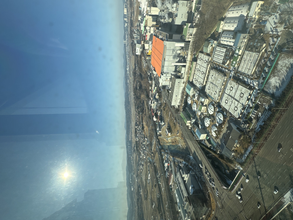 An aerial view shows a sprawling industrial complex adjacent to a populated town, under a hazy, bright sky. The complex features multiple large, square buildings, numerous cylindrical tanks, and an orange-roofed structure. A road runs along the edge of the complex, with cars visible. The town extends into the distance, blending with the hazy horizon. The image appears to be taken from a high vantage point, possibly from a building or aircraft, and reflects light off a window.