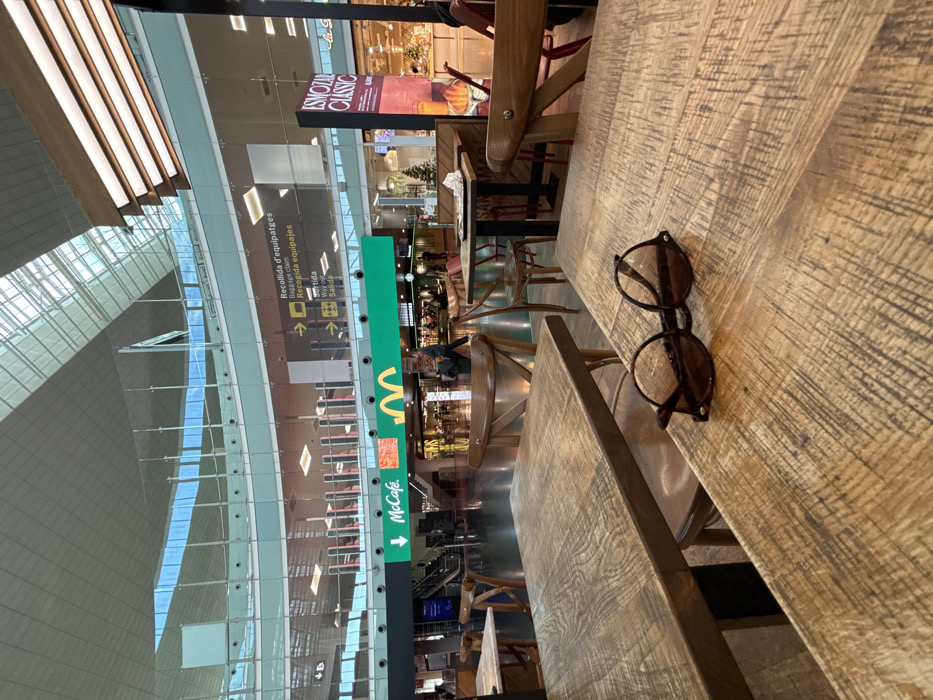 The image presents a modern airport terminal interior, specifically Barcelona-El Prat Airport in el Prat de Llobregat, Spain. The perspective is low, looking across a dining or seating area towards the main concourse. In the immediate foreground, a pair of dark-framed, round sunglasses with dark tinted lenses lies on a rustic, distressed wooden table. A portion of an adjacent, similar wooden table is visible to the left. The midground features more wooden tables and chairs, some appearing empty, others partially obscured. Beyond these, a wide, open concourse is observed. A prominent green digital banner sign displays "McCafe" with a downward arrow, and the McDonald's "M" logo. Below this, escalators are visible, leading to a lower level. Various commercial establishments line the concourse, including a discernible Starbucks sign and a partial advertisement for "ESMOZAR CLASSIC." One individual, dressed in dark clothing, walks across the concourse towards the left. The background reveals the terminal's expansive architecture: multiple levels with glass railings, and a high, curved ceiling incorporating large glass panels within a metal framework, admitting natural light. Large informational signage is affixed to a distant wall, clearly displaying "Recollida d'equipats" (Baggage claim) and "Way out Salida" with directional arrows, confirming the airport environment and multilingual context.
