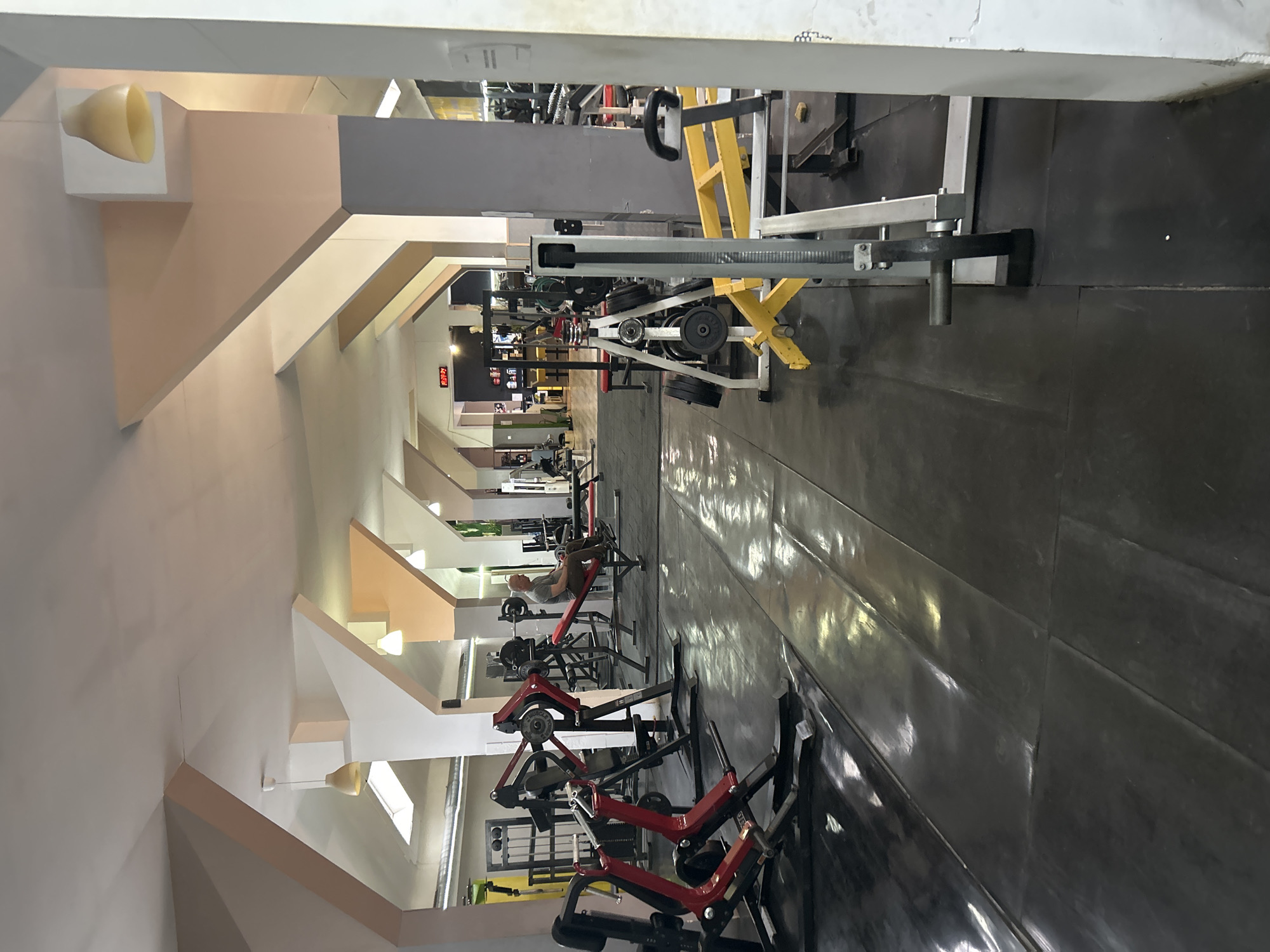 The image depicts the interior of a gym in Vratsa, Bulgaria. The gym is long and narrow, with weightlifting machines arranged along the length of the room. The floor is covered in black rubber matting. The walls are white with beige and grey accents. The ceiling has a repeating pattern of triangular recesses, each containing a light fixture. Exercise machines of various types are visible, many in black and red. A person is using a leg press machine towards the back of the gym. A digital clock is visible on the back wall.